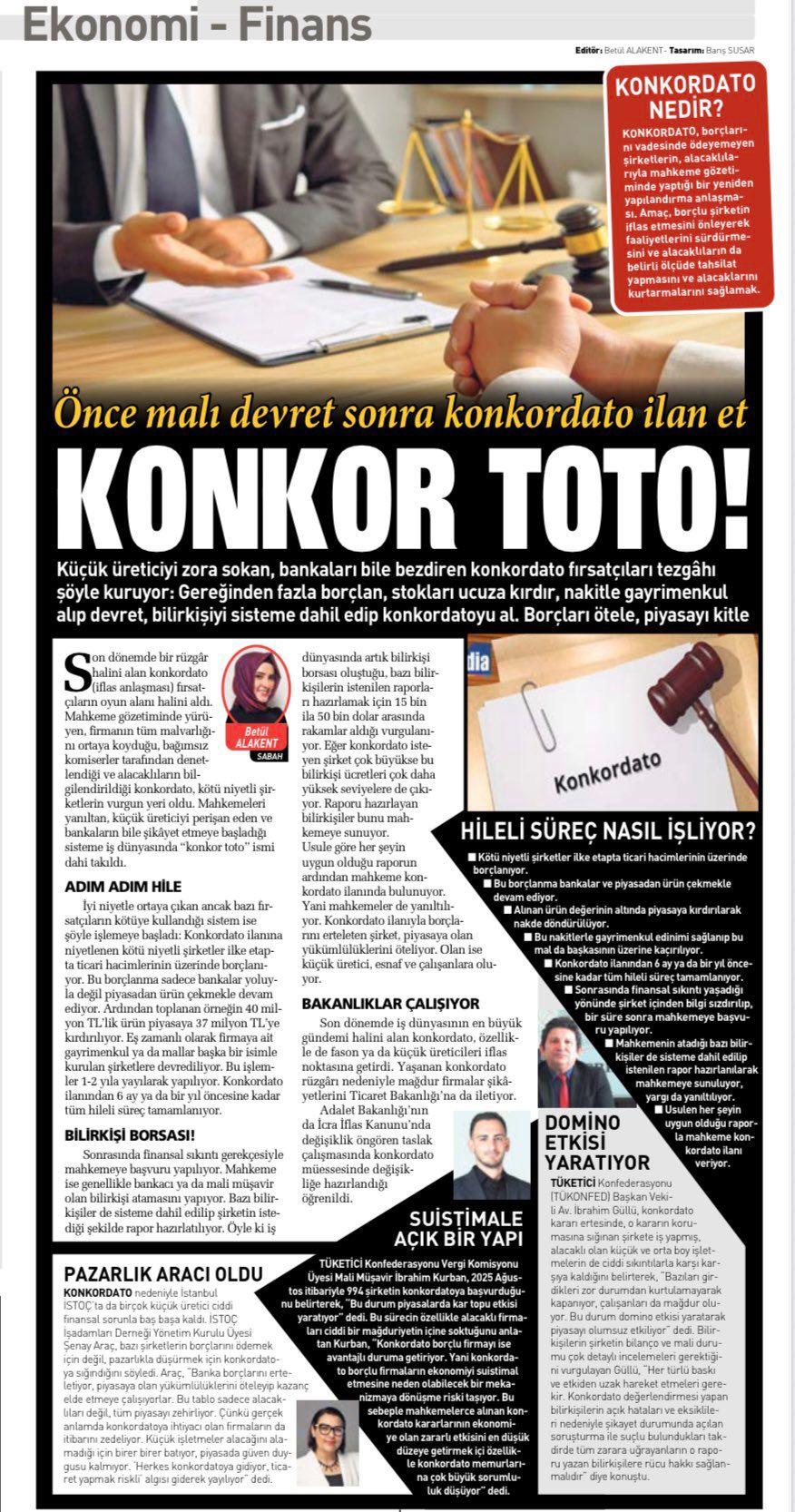 Tüketici Konfederasyonu Vergi Komisyonu Üyesi Mali Müşavir İbrahim Kurban, 2025 Ağustos itibariyle 994 şirketin konkordatoya başvurduğunu belirterek, "Bu durum piyasalarda kar topu etkisi yaratıyor" dedi. Bu sürecin özellikle alacaklı firmaları ciddi bir mağduriyetin içine soktuğunu anlatan Kurban, "Konkordato borçlu firmayı ise avantajlı duruma getiriyor. Yani konkordato borçlu firmaların ekonomiyi suistimal etmesine neden olabilecek bir mekanizmaya dönüşme riski taşıyor. Bu sebeple mahkemelerce alınan konkordato kararlarının ekonomiye olan zararlı etkisini en düşük düzeye getirmek içi özellikle konkordato memurlarına çok büyük sorumluluk düşüyor" dedi.